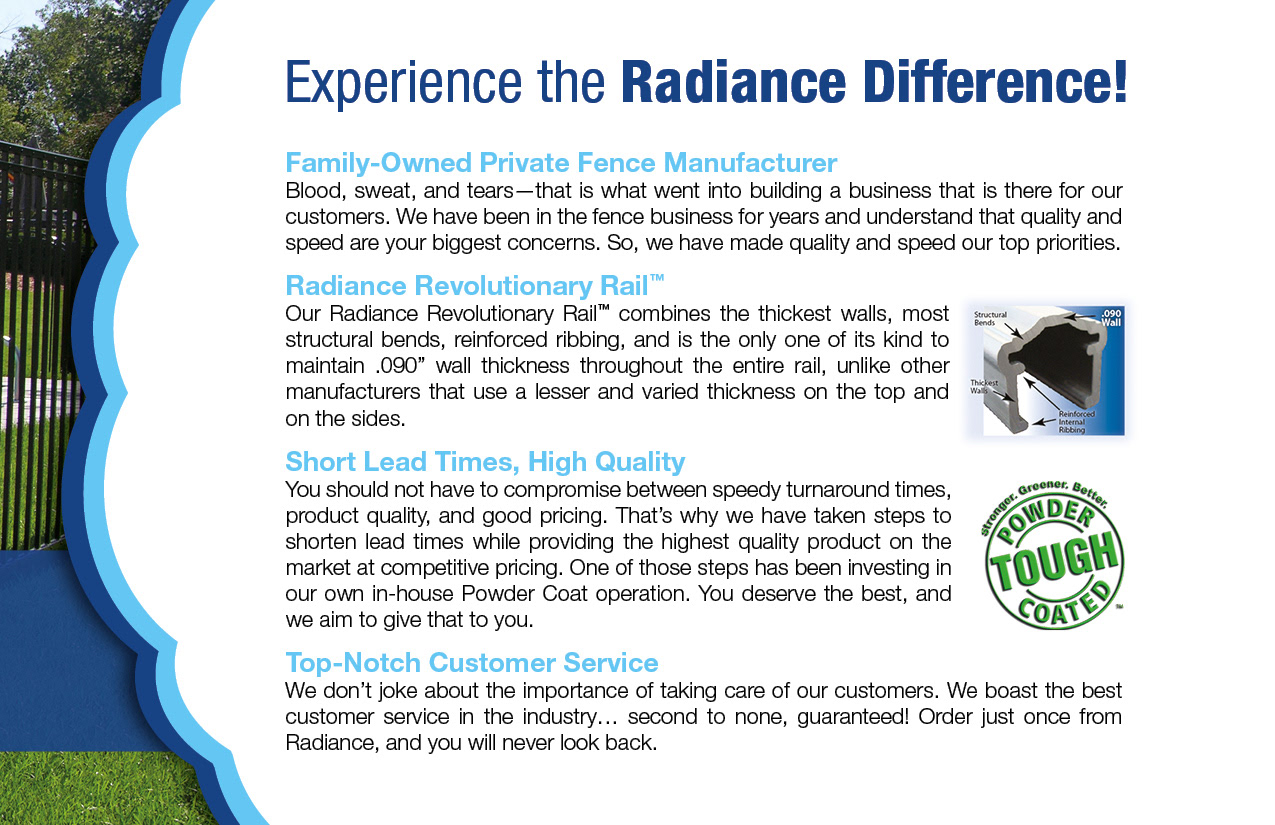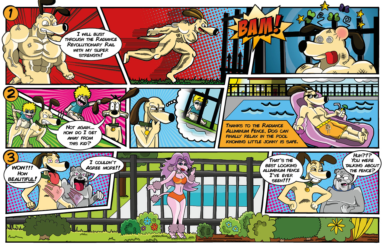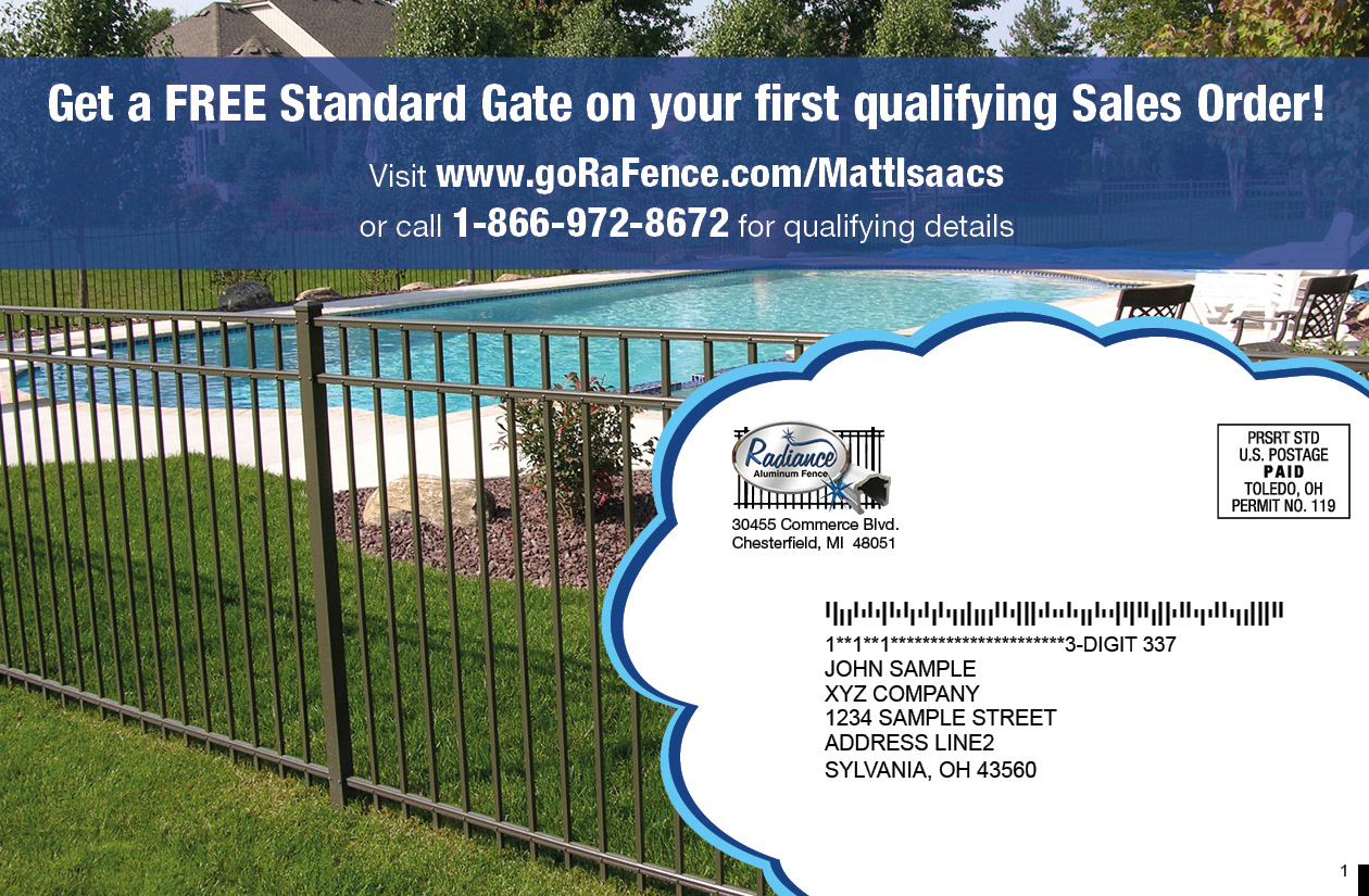 This fence company, Radiance Fence, let me get a little creative; I created a comic strip within their trifold mailer to tell a story that showcases their fence's durability. The address that gets merged on the back was also done so using variable data.