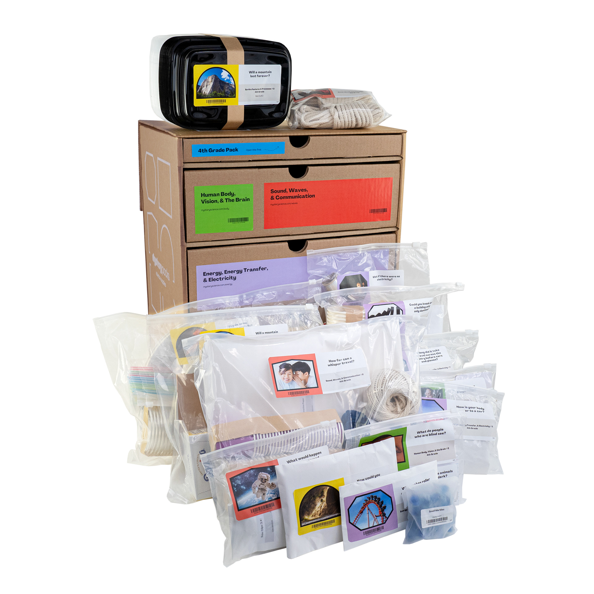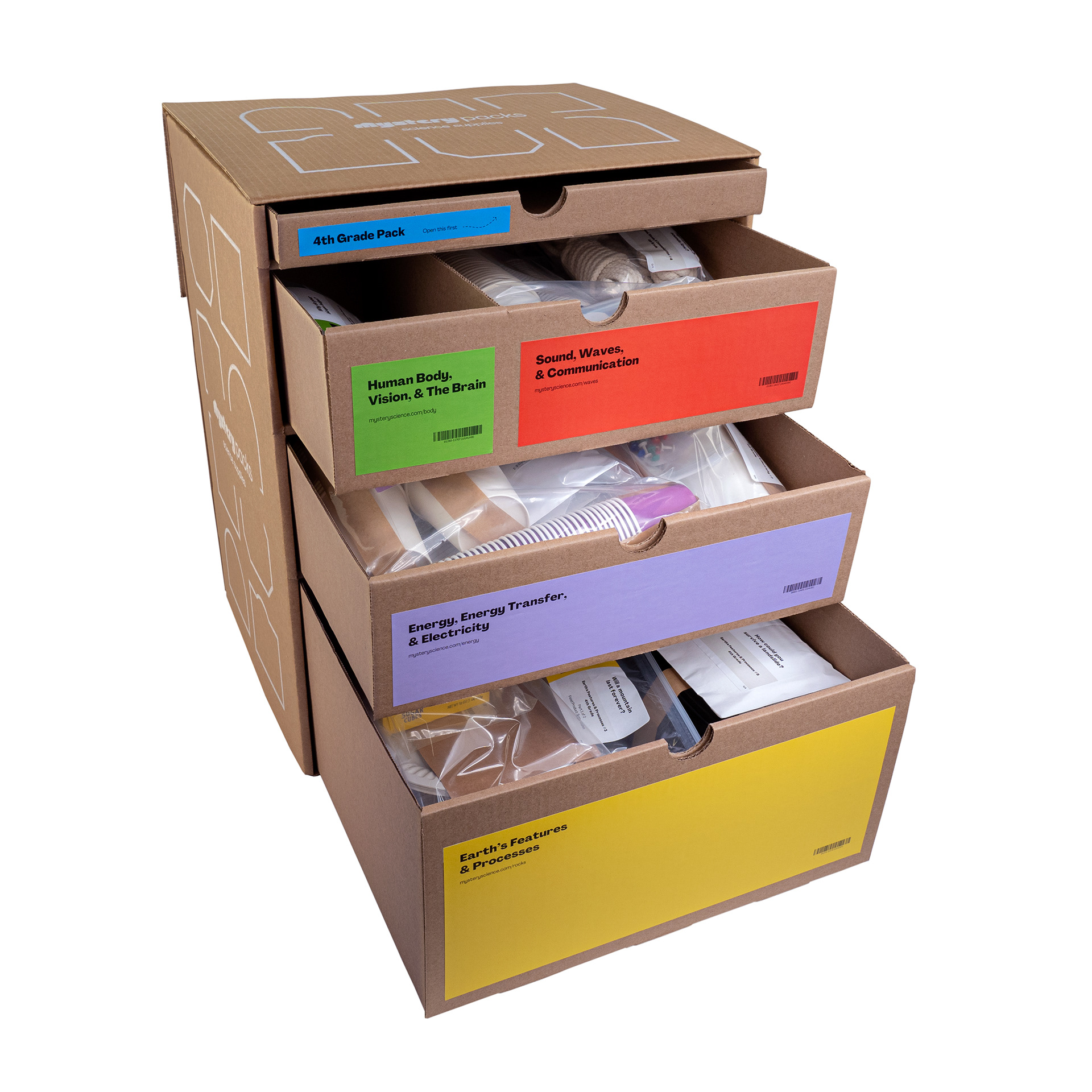 These are photos taken to showcase Mystery Science's boxes themselves as well as all of the supplies that are stored inside.